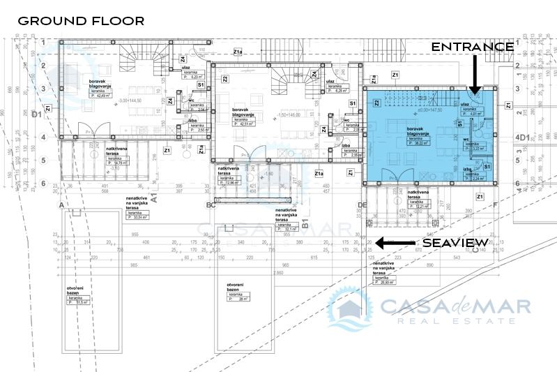 Prizemlje sadrži dnevni boravak sa kuhinjom i blagovaonom. Kod ulaza se nalazi toalet, a u sklopu kuhinje se nalazi ostava. Iz dnevnog boravka se izlazi na natkrivenu terasu i okućnicu koja pruža predivan otvoreni pogled na more. Unutarnjim stepeništem se dolazi na kat gdje su smještene dvije spavaće sobe i jedna kupaonica.