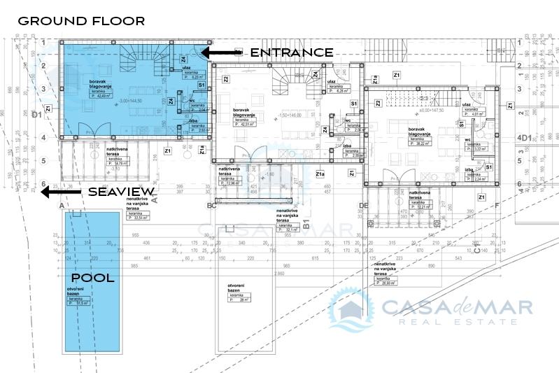 Prizemlje kuće se sastoji od dnevnog boravka sa kuhinjom i blagovaonom. Kuhinji pripada ostava, a pored ulaza je smješten toalet. Iz dnevnog boravka se izlazi na natkrivenu terasu i okućnicu koja pruža predivan otvoreni pogled na more.