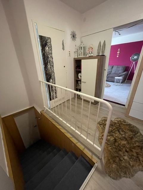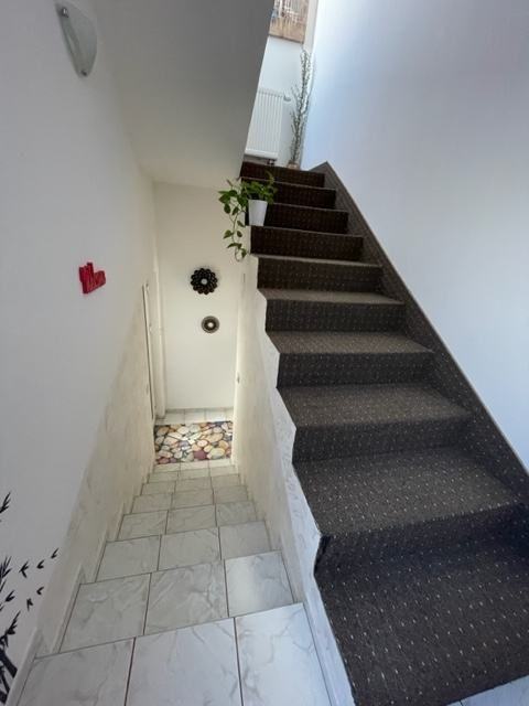 Kat - (poluetaža) - stepenice, hodnik, kupaonica (tuš), spavaća soba, dnevni boravak s blagovaonom i kuhinjom koja ima izlaz na balkon