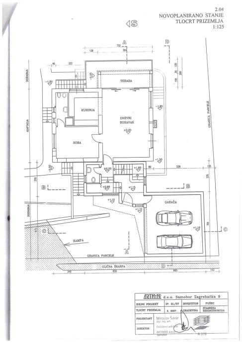 Smještaj vozila je osiguran u luksuznoj garaži kapaciteta 2-3 vozila, kojoj vodi grijana pristupna rampa sa senzorima. Pored toga, uz kuću se nalazi parking za 2-3 automobila.