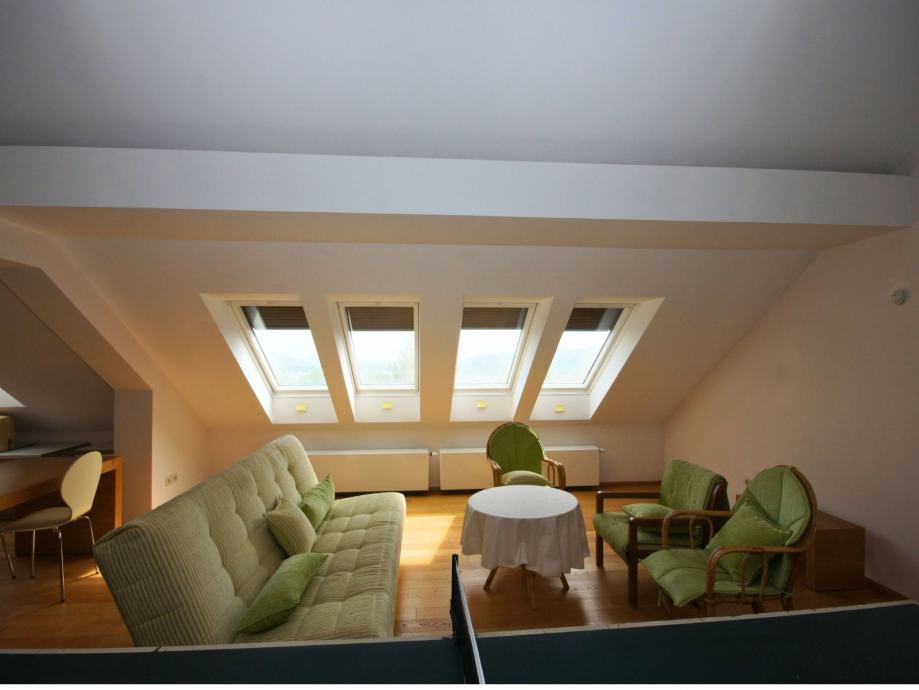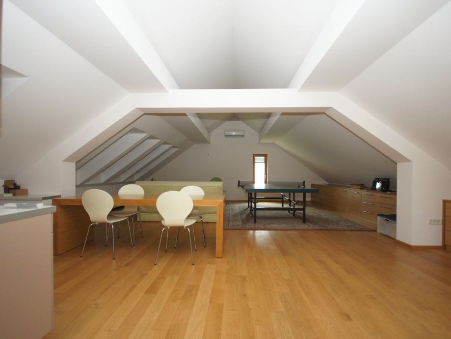 Potkrovlje je uređeno kao otvoreni prostor za zabavu sa ugodnim kutkom za druženje i kuhinjom. Veliki krovni prozori s roletama na elektromotor prostoru daju suvremeni karakter i obilje prirodnog svjetla.