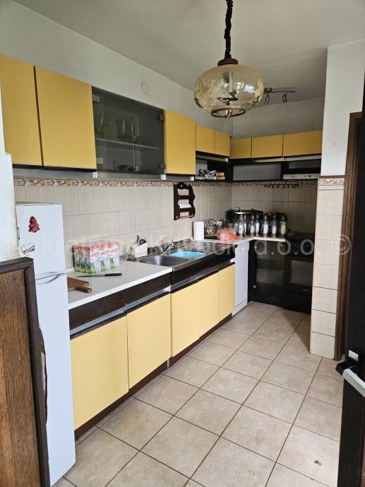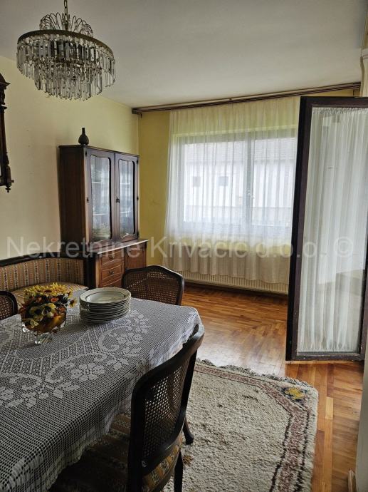 Glavni stambeni prostor je u visokom prizemlju vel. 114,25 m2 s natkrivenim ulazom, hodnikom, izbom, dvije sobe, dnevnim boravkom s izlazom na natkrivenu terasu, kuhinjom, kupaonicom i wc-om.Unutarnje stubište vodi na kat gdje su još tri sobe s izlazom na balkon i dodatna kupaonica.