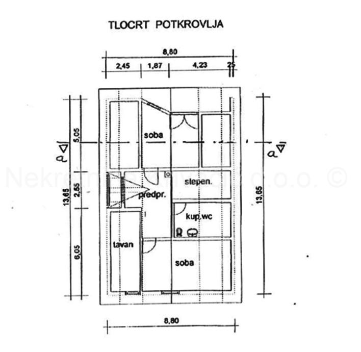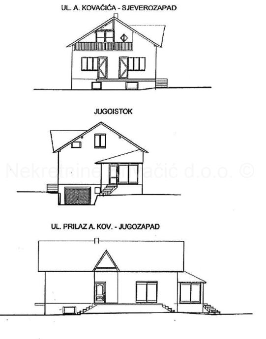 Ul. A. KOVAČIĆA, naselje obiteljskih kuća s okućnicama, mirno i urbano. Kuća 274 m2 sastoji se od podruma, visokog prizemlja i potkrovlja. Izgrađena 2006 godine, te adptiranog krovišta 2008 godine.