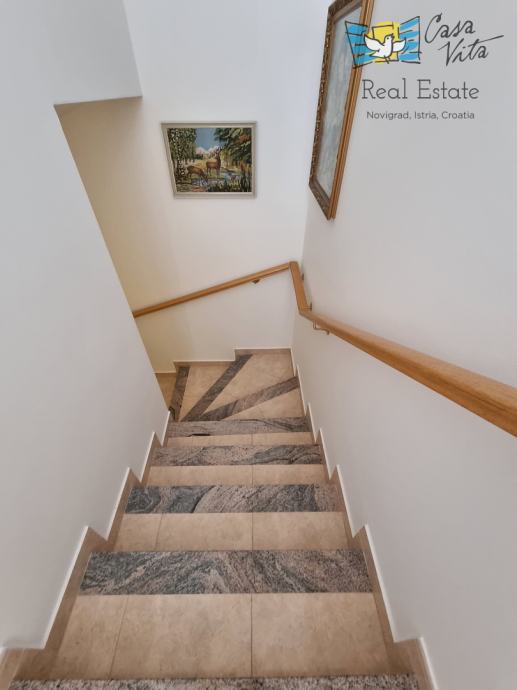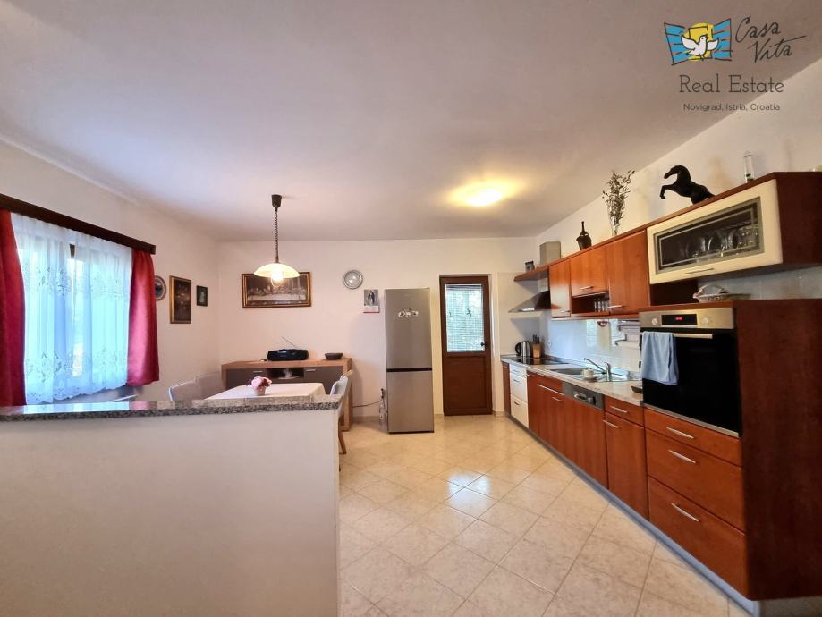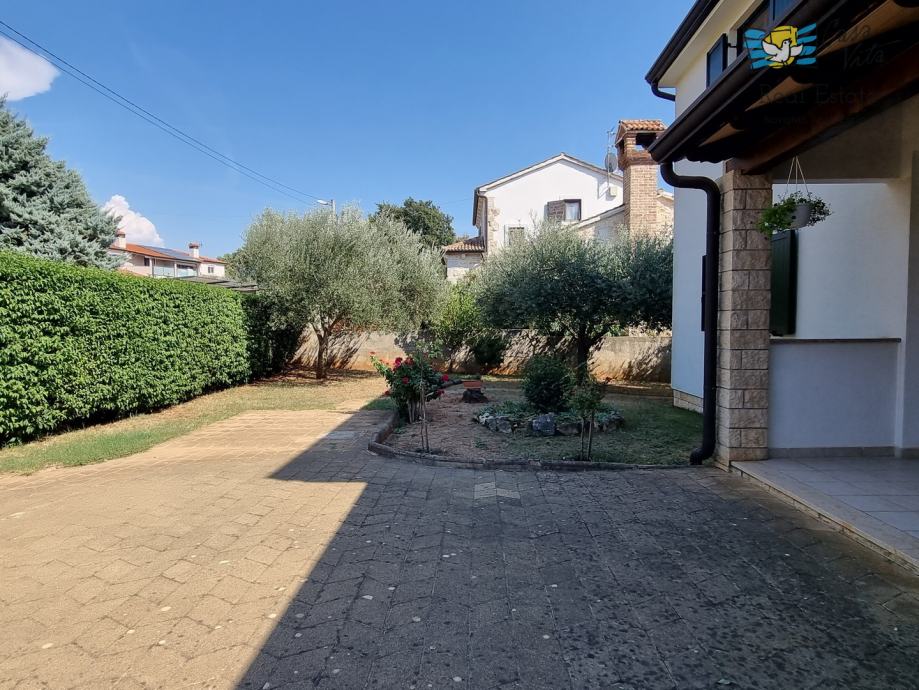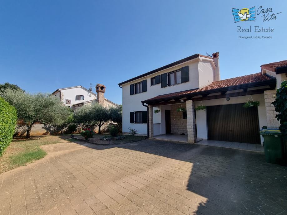 Prelijepa obiteljska kuća izgrađena 2004. godine, prodaje se u mirnom naselju nedaleko od Tara (5 km). Smještena je na parceli od 580 m2. Sastoji se od tri etaže: polusuterena, prizemlja i kata. Na ulazu u parcelu predviđen je prostor za parkiranje, no kuća ima i garažu od 17,70 m2. Sa parkinga se ulazi u prizemlje kuće gdje se nalazi mali ulazni hodnik, blagovaona sa kuhinjom, kupaona, spremište te dnevni boravak sa kaminom. Iz dnevnog boravka se izlazi na natkriveni balkon od 9,60 m2. Unutarnjim se stepenicama odlazi na kat gdje su smještene dvije spavaće sobe i još jedna kupaona. Iz blagovaone se izlazi u vrt gdje se stepenicama dolazi do polusuterena u kojem se nalazi veliki prostor koji vlasnici koriste kao konobu za druženja, spremišta, praonu i slično, a može se koristiti i u druge svrhe. U stražnjem dijelu vrta nalaze se masline i veliki kamin za roštiljanje. Ova kuća nema bazena, no postoji mogućnost gradnje. Grijanje je regulirano putem centralnog sistema na lož ulje, ima jednu klimatsku jedinicu na katu, te kamin u dnevnom boravku. Stolarija je PVC. Idealna je za one koji traže obiteljsku kuću na mirnoj lokaciji sa malo okućnice i garažom. Predstavlja i potencijal za turistički najam.
