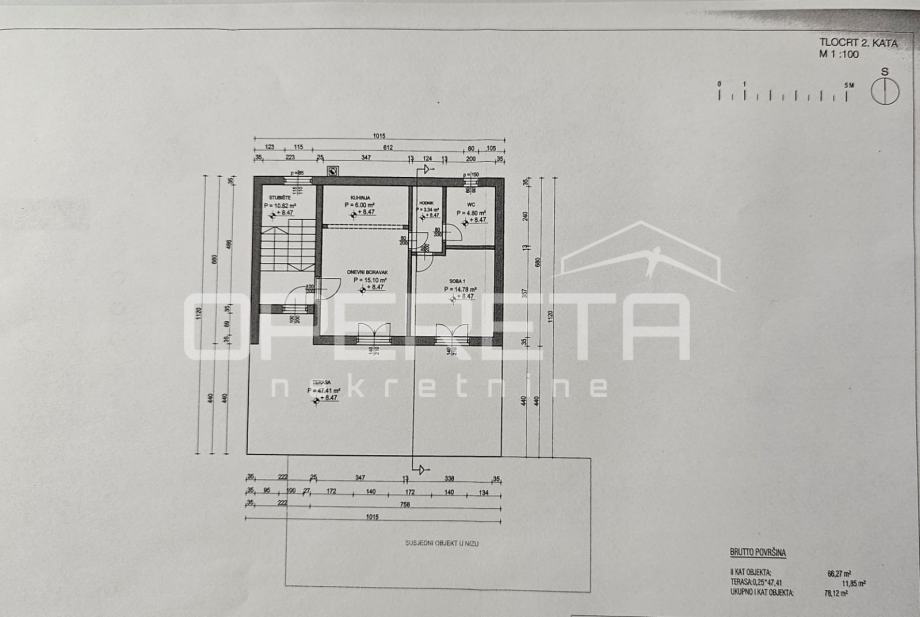 Drugi kat čini zasebna stambena jedinica s jednom spavaćom sobom, hodnikom, kupaonicom te kuhinjom, blagovaonicom i dnevnim boravkom. Posebna vrijednost ove etaže je velika natkrivena terasa površine čak 48 m².