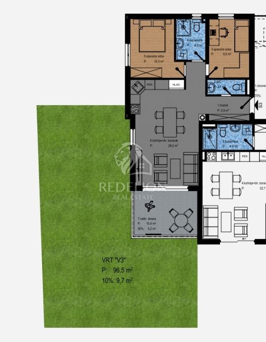 Zamislite jutro uz miris svježe kave na natkrivenoj terasi, dok se sunce polako probija kroz lišće vrta od gotovo 97 m² – upravo ovako izgleda život u ovom predivnom trosobnom stanu s dnevnim boravkom i kuhinjom od 28 m². Svaki kutak stana osmišljen je za udobnost, praktičnost i osjećaj doma.