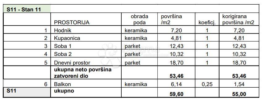 Stan se sastoji od od hodnika, dnevnog boravka s blagavaonicom, 2 spavaće sobe, kupaonice te balkona.