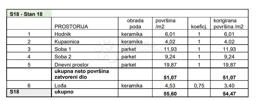 Stan se sastoji od od hodnika, dnevnog boravka s blagavaonicom, 2 spavaće sobe, kupaonice te lođe.