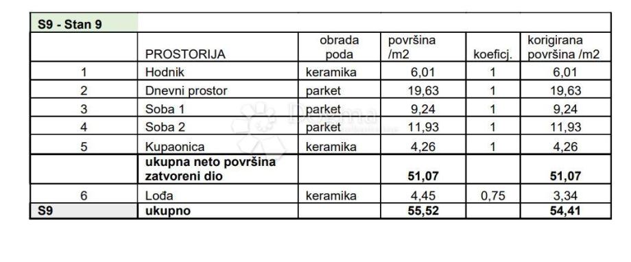 Stan se sastoji od od hodnika, dnevnog boravka s blagavaonicom, 2 spavaće sobe, kupaonice te lođe.
