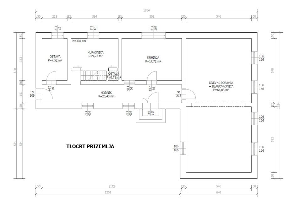 U prostoru prizemlja se nalazi kuhinja sa blagavaonicom, hodnik, ostava, kupaonica i velik dnevni boravak sa blagavaonicom.