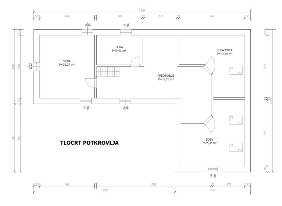 Ukupna bruto površine stambene zgrade iznosi 234,57 m2. Kuća se sastoji od prizemlja i potkrovlja.