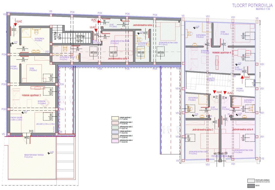 -prizemlje: dva apartmana, recepciju, hodnik, kuhinju, prostor za posluživanje jela i pića, sanitarni čvor, garderobe i natkrivenu vanjsku terasu