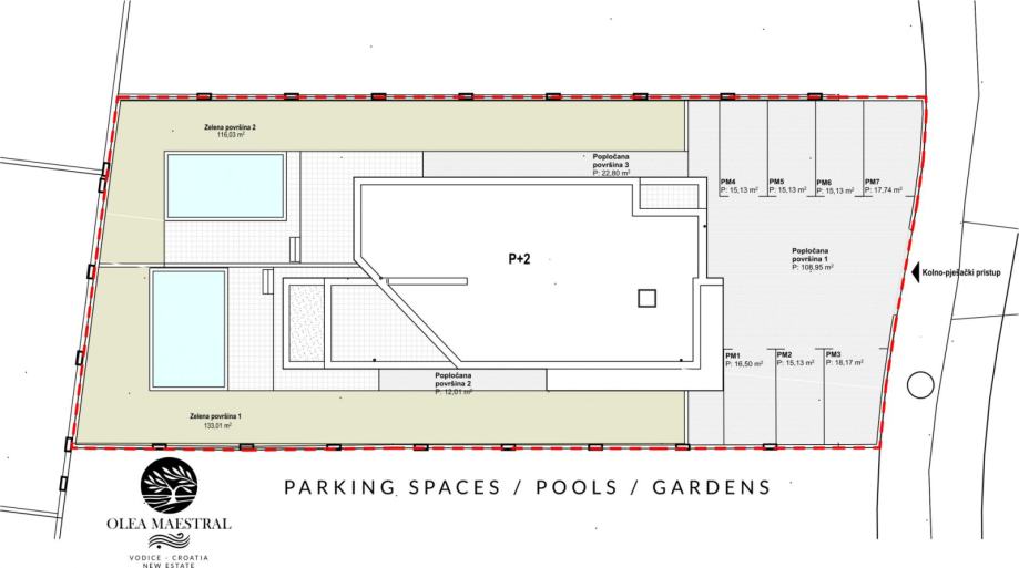Luksuzni stan S2 s bazenom i prostranim vrtom, smješten u manjoj zgradi s ukupno četiri stambene jedinice. Stan se nalazi u prizemlju i nudi savršen spoj modernog dizajna, vrhunske kvalitete i komfora. Ukupna neto korisna površina iznosi 128,94 m², a dodatnu vrijednost pružaju bazen površine 23,76 m², zelena površina od 116 m² te popločana terasa od 22,8 m².