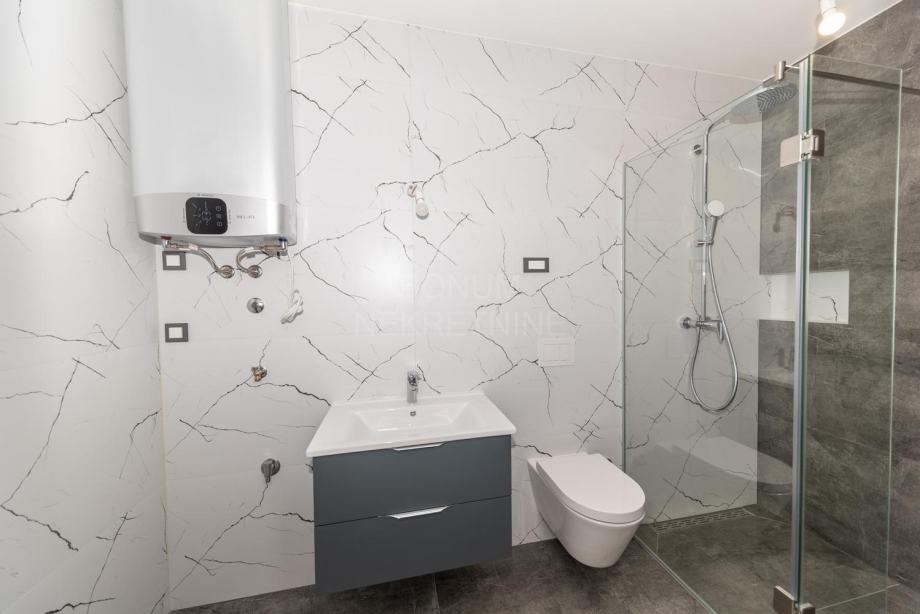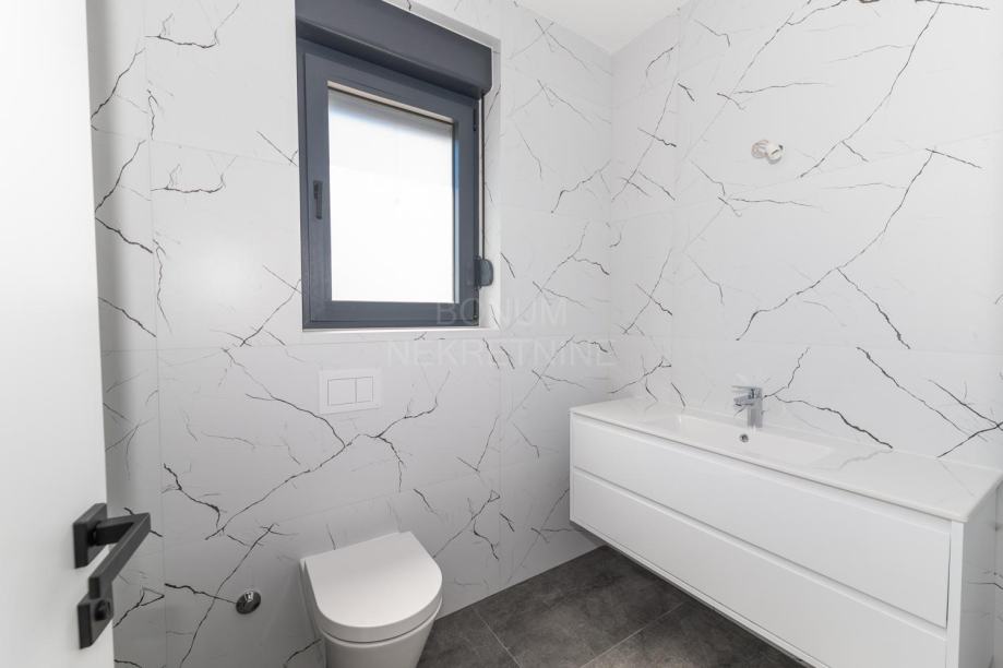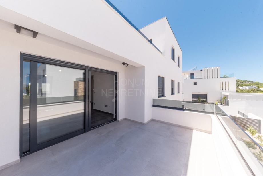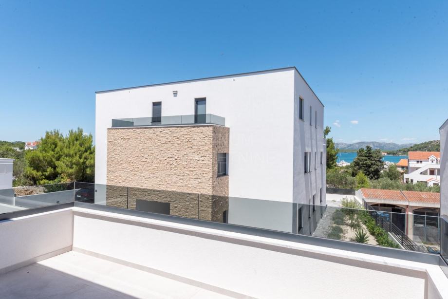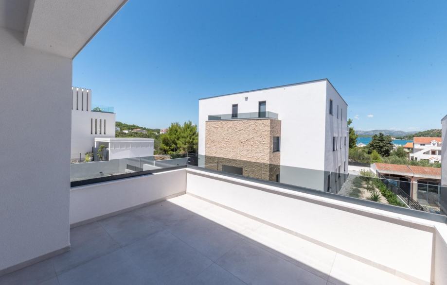 Prodaje se apartman na prvom katu nove zgrade na Murteru, udaljen svega 170 metara od mora i plaže. Sastoji se od hodnika, kuhinje, blagovaonice i dnevnog boravka, dvije kupaonice, tri spavaće sobe, natkrivene terase s koje se pruža pogled na more. Apartman je opremljen inverter klima uređajima, podnim grijanjem u kupaonicama i protuprovalnim vratima, te mu pripada jedno parkirno mjesto. Apartman je odmah useljiv. U sustavu je PDV-a. Odličan izbor bilo za ljetni boravak bilo za stanovanje tijekom cijele kalendarske godine.