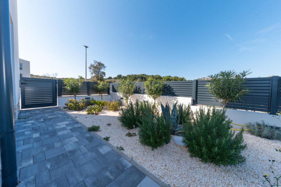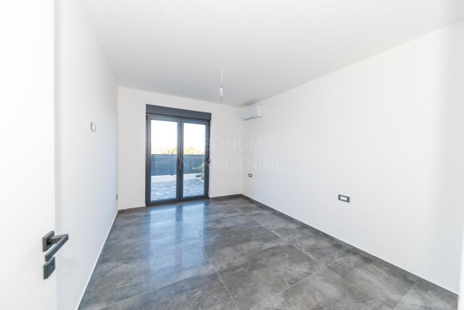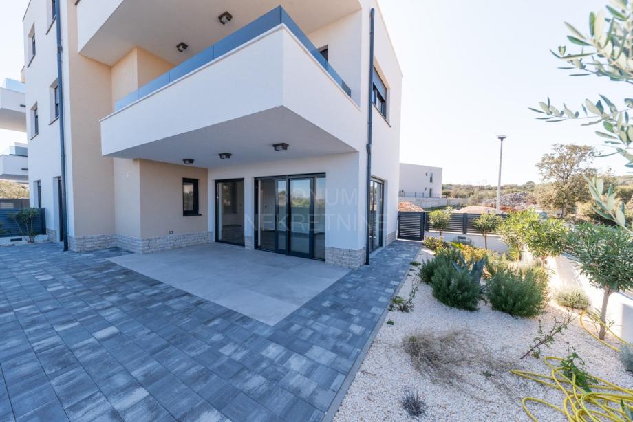 Na atraktivnoj lokaciji u Murteru, samo 350 metara od plaže, prodaje se moderan dvoiposoban apartman smješten u prizemlju manje stambene zgrade s ukupno šest jedinica. Apartman ima ukupnu korisnu površinu od 91,06 m², a stambeni dio obuhvaća 68,76 m². Sastoji se od prostranog dnevnog boravka s kuhinjom i blagovaonicom, dvije spavaće sobe i kupaonice. Iz dnevnog boravka pruža se izlaz na natkrivenu terasu od 13,96 m². Dvorište se prostire na 85 m². Apartmanu pripadaju i dva parkirna mjesta ukupne površine 26,50 m².