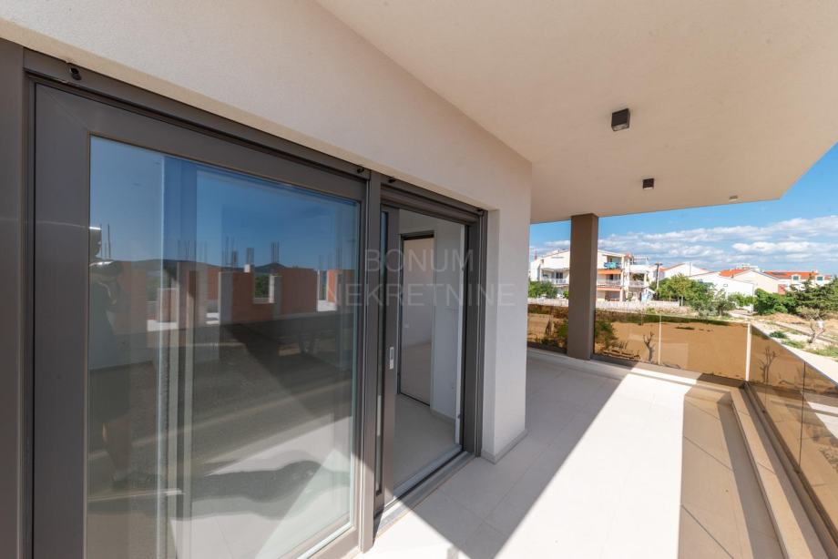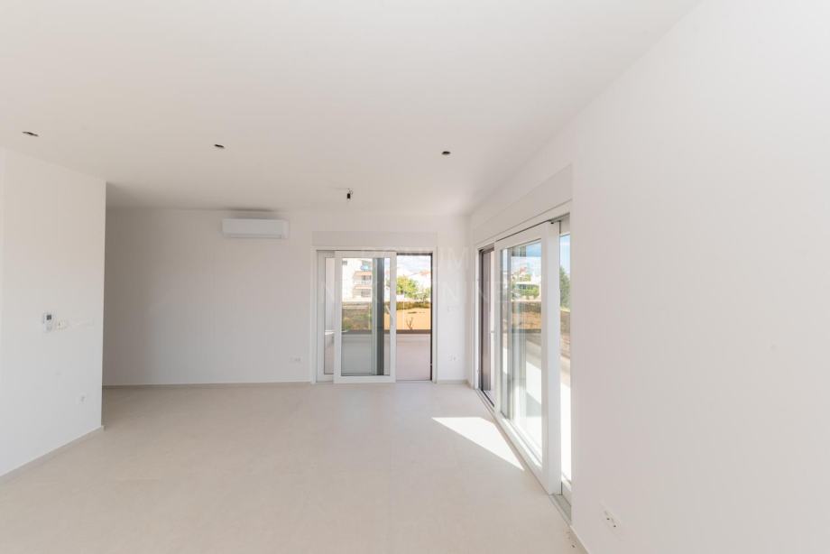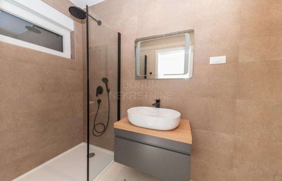 Stan je opremljen kvalitetnim i modernim materijalima i sadržajima koji osiguravaju visoku razinu udobnosti i sigurnosti. Ima stiropor fasadu koja jamči dobru izolaciju, PVC stolariju s komarnicima i rolete s električnim podizačima. Ulazna vrata su protuprovalna i protupožarna, a podne obloge čine elegantne talijanske keramičke pločice. Kupaonice su opremljene suvremenim sanitarnim elementima, a u svim prostorijama postavljeno je podno grijanje i klima uređaji. TV i internet priključci nalaze se u svakoj sobi, što omogućuje potpunu funkcionalnost i udobnost.