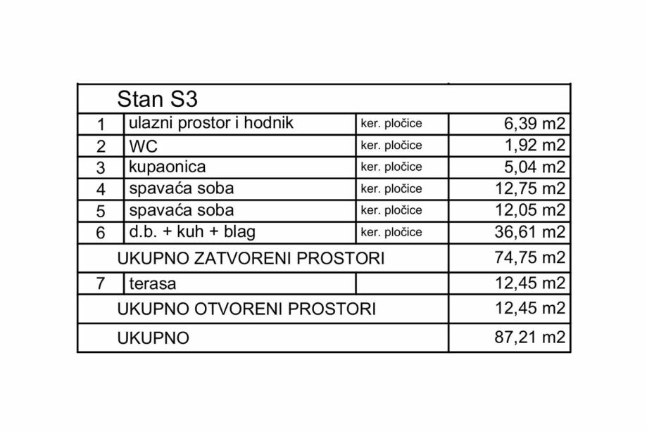 Prodaje se prostrani apartman u prizemlju S3: Luksuzan apartman ukupne površine 87,21 m² (unutarnji dio 74,75 m² + terasa 12,45 m²)