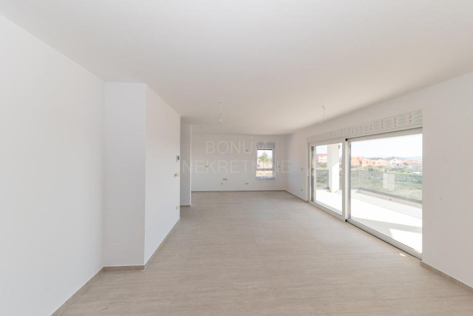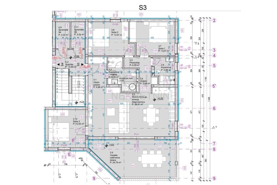 S3- prvi kat. Sastoji se od dvije spavaće sobe, dvije kupaone, hodnika, dnevnog dijela s kuhinjom i blagovaonom u jednoj cjelini te natkrivene terase .