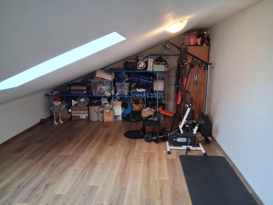 Na donjoj etaži nalazi se moderna kuhinja s blagovaonom i dnevnim boravkom u open-space varijanti s izlazom na južni balkon, zatim kupaonica te dvije spavaće sobe. Na gornjoj etaži smještena je spavaća soba, te još dodatna soba koja trenutno služi kao spremište i teretana. Dodatna prednost je što postoji priprema za vodu, pa se na ovoj etaži može izvesti i dodatni sanitarni čvor.
