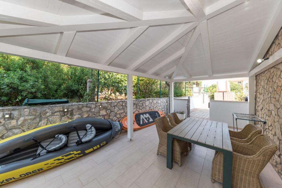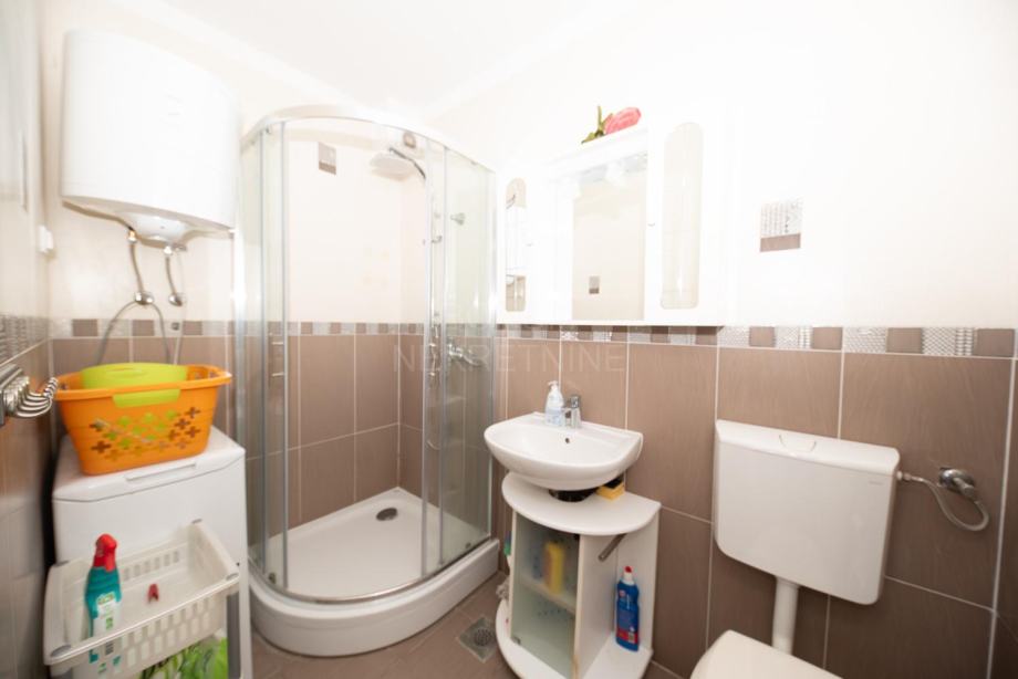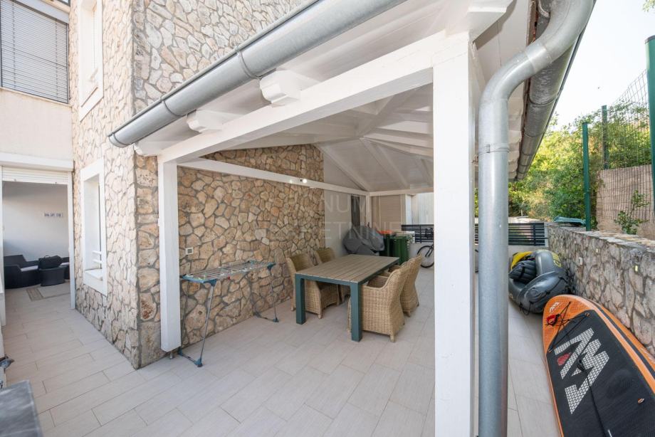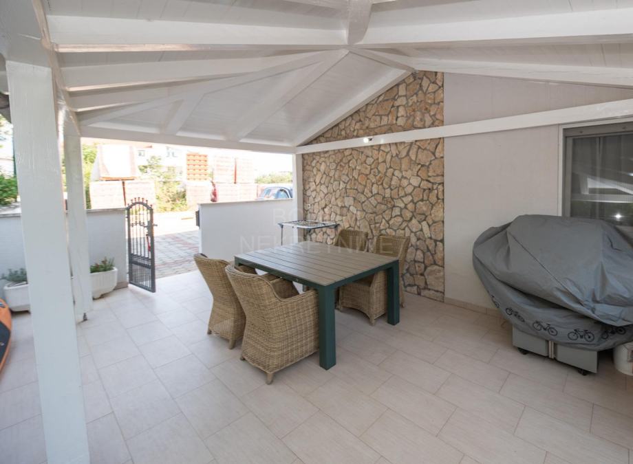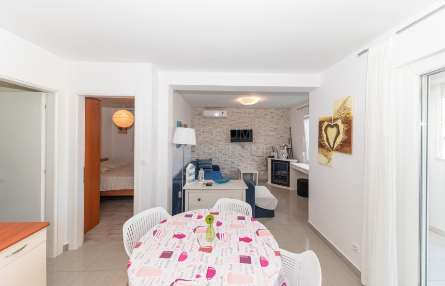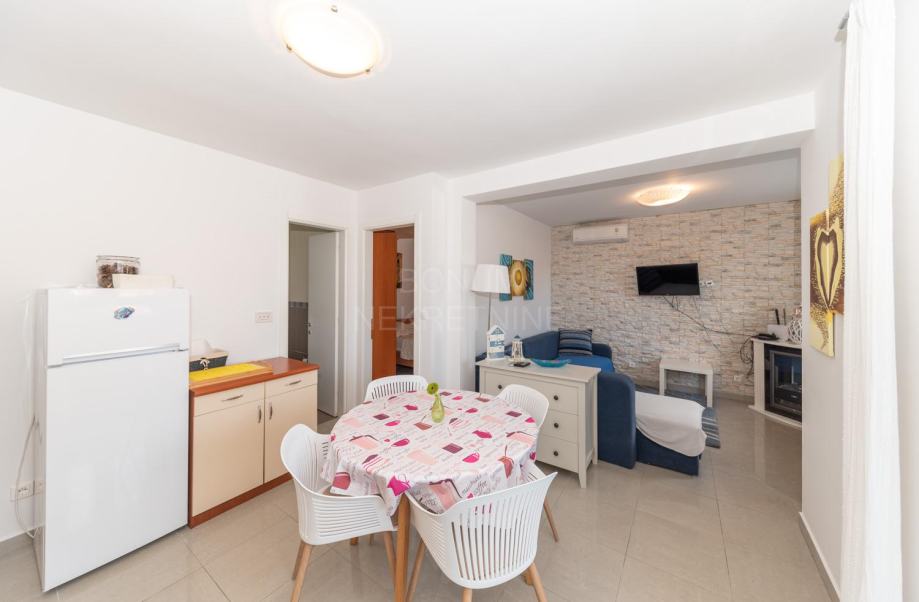 Stan se prodaje potpuno namješten, a sastoji se od jedne spavaće sobe, kupaonice, klimatiziranog dnevnog boravka s kuhinjom i blagovaonicom te izlazom u vlastito ograđeno dvorište površine 30 m². Iz dnevnog boravka izlazi se i na natkrivenu terasu od 10 m², koja se po potrebi može zatvoriti i koristiti kao ostava ili dodatni prostor za boravak tijekom zimskih mjeseci.