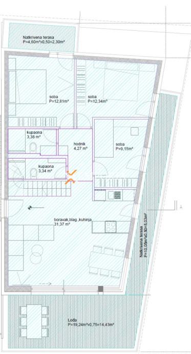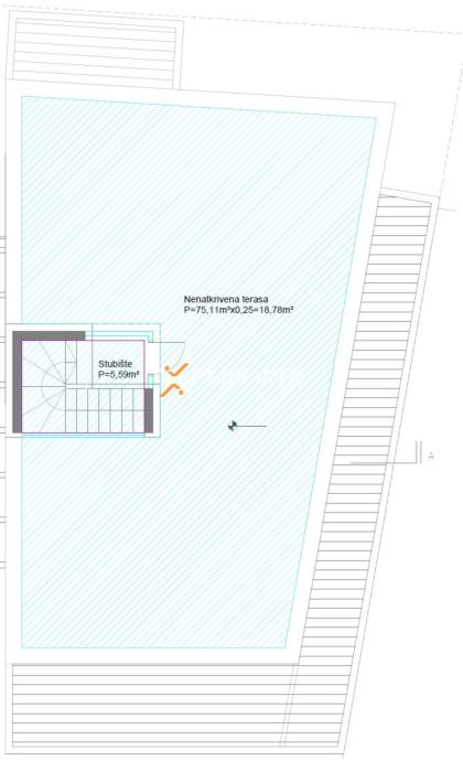 Ovo je stan na 2. katu zgrade. Raspored prostorija čine hodnik, dvije kupaonice, tri spavaće sobe, kuhinja s blagovaonicom i dnevnim boravkom, lođa te dvije natkrivene terase. Iz stana se stubištem ide na vlastitu krovnu terasu površine 75,11 m2. Neto korisna površina opisanih prostorija iznosi 122,79 m2.