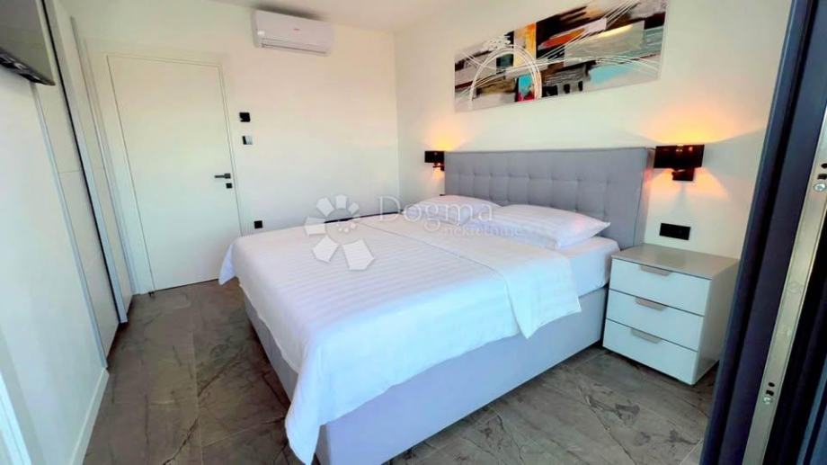 Stan ima tri prostrane spavaće sobe, a svaka soba ima vlastitu kupaonicu, što pruža maksimalnu privatnost i komfor, bilo za obitelj, poslovne ljude ili dijeljenje stana. Uz to, u stanu se nalazi i dodatni WC za goste. Posebna prednost ovog stana je činjenica da se iz svake prostorije pruža otvoren pogled na more, a iz svakog kreveta moguće je uživati u pogledu na more, što stanu daje jedinstvenu vrijednost i poseban osjećaj luksuza.