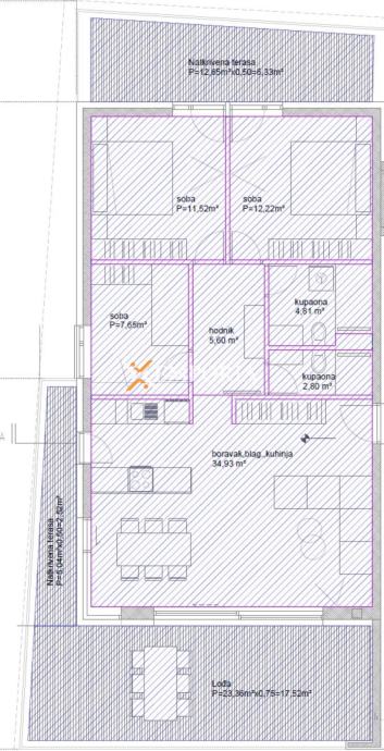 Es handelt sich um eine Wohnung im 1. Stock des Gebäudes. Die Raumaufteilung besteht aus einem Flur, zwei Bädern, drei Schlafzimmern, einer Küche mit Esszimmer und Wohnzimmer, einer Loggia, einer überdachten Terrasse und einer nicht überdachten Terrasse. Die Nettonutzfläche der beschriebenen Räumlichkeiten beträgt 105,90 m2.