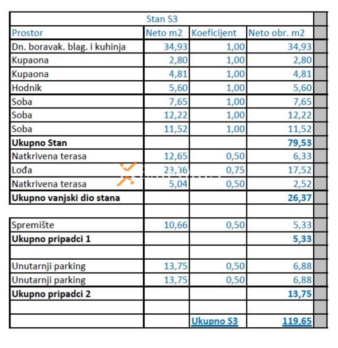 Dodatno stanu pripada spremište i dva garažna parkirališna mjesta. Ukupna neto površina s pripacima iznosi 119,65 m2.