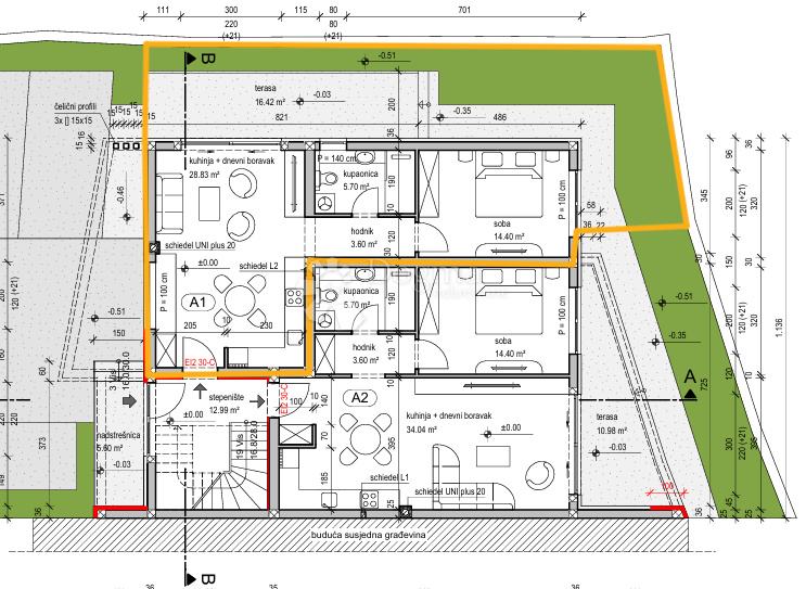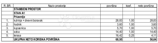 Stan “A1” smješten u prizemlju, ukupne netto površine sa koeficijentima 56.64 m² sa izvrsno osmišljenim rasporedom: