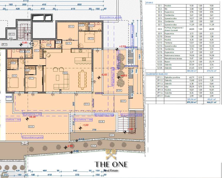 Stan se nalazi u prizemlju te se pri ulasku iz hodnika ulazi u prostrani otvoreni prostor koji se sastoji od dnevnog boravka, blagovaonice i kuhinje. Dnevni boravak ima velike staklene prozore od poda do stropa, koji pružaju obilje prirodnog svjetla i spektakularan pogled na more iz svakog kuta.