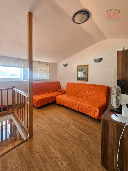 Gornja etaža (mansarda): predsoblje, kupaonica, dvije spavaće sobe (jedna s pogledom na more)