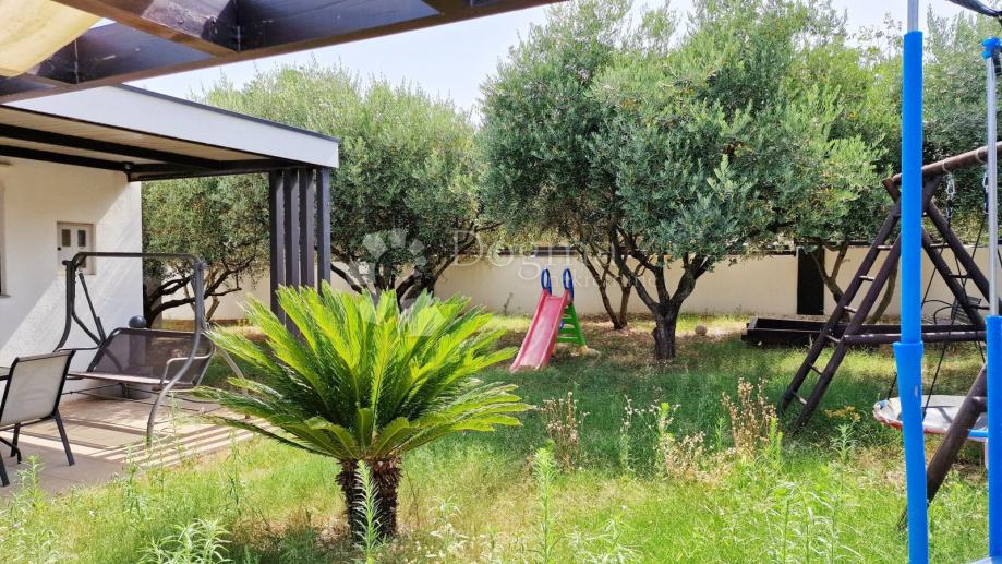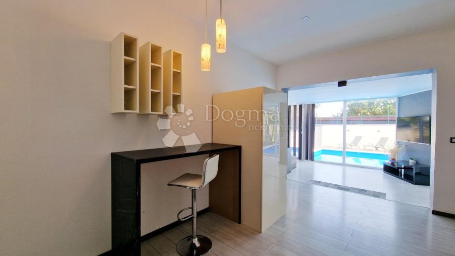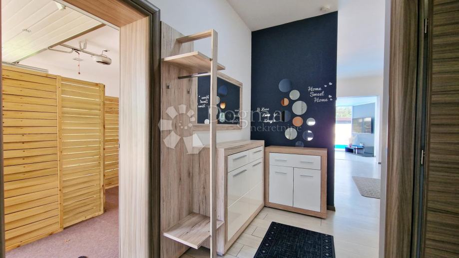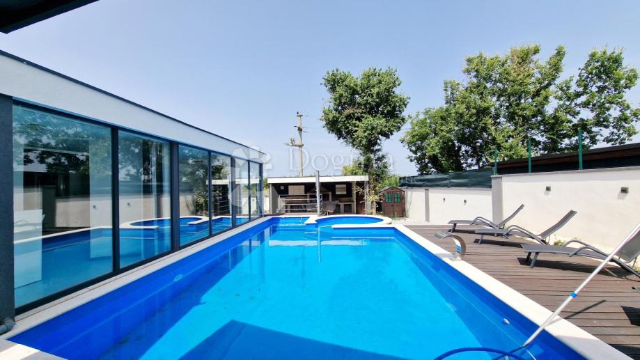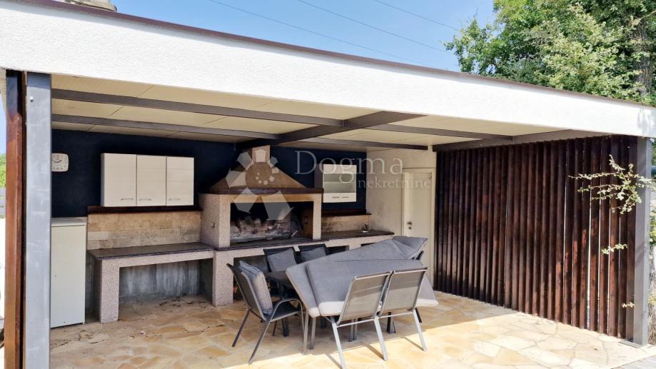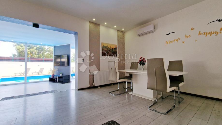 Samostojeća prizemnica površine 194 m2, 3 spavaće sobe, 2 kupaone, velika garaža, radna soba, ljetna kuhinja s kaminom za roštilj i vodom, mogućnost vanjskog wc, bazen 49 m2, whirlpool, sunčalište, natkriveni parking, 900 m2 lijepe okućnice, mirna lokacija, uredan pristup sa ceste, dobra povezanost… ova kuća ima sve!