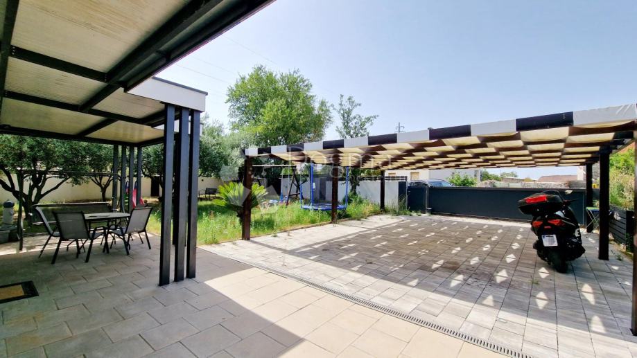 Sa prednje strane kuće nalazi se veliki natkriveni parking koji ima dovoljno mjesta za 4 auta, dok u garažu može stati još 2, te je na kraju garaže i dodatna prostorija u namjeni radne sobe ili ostave.