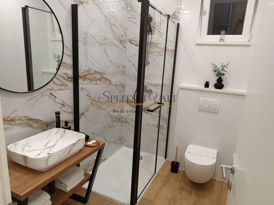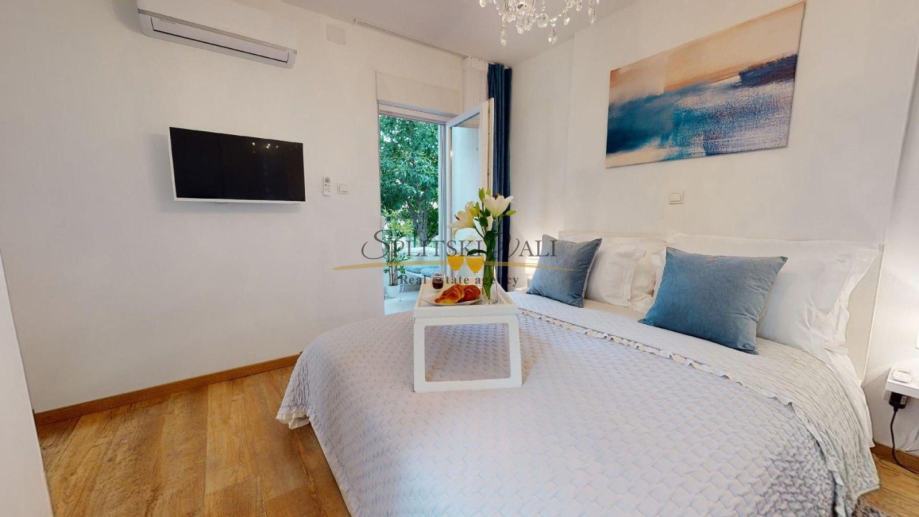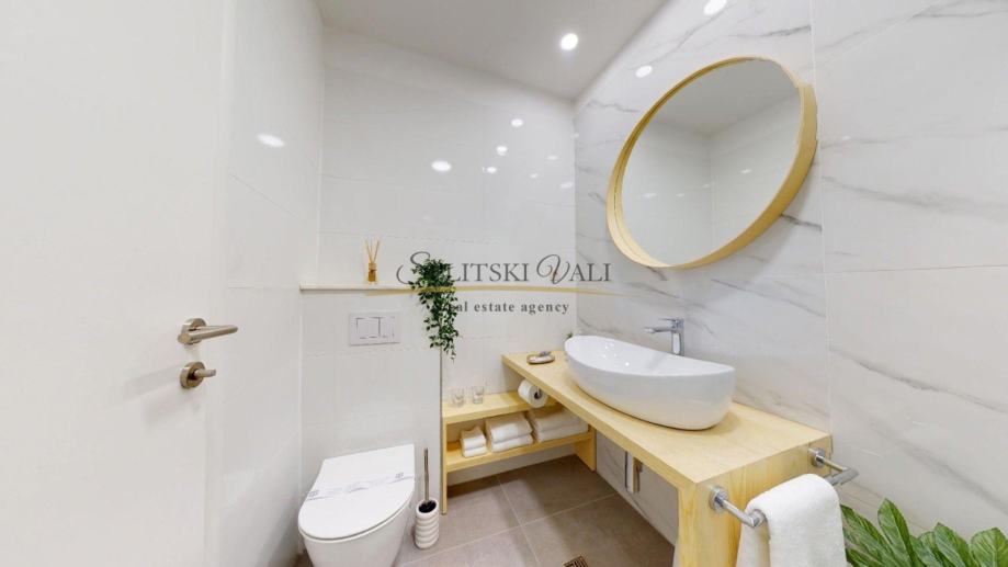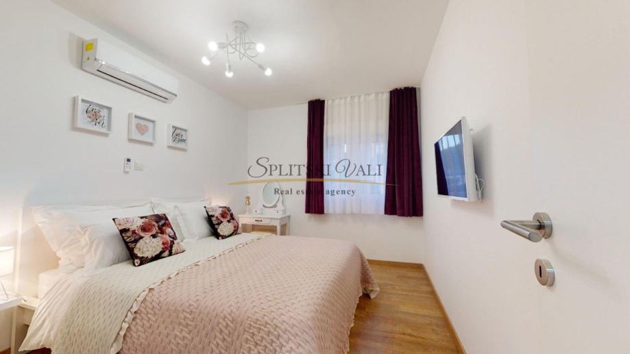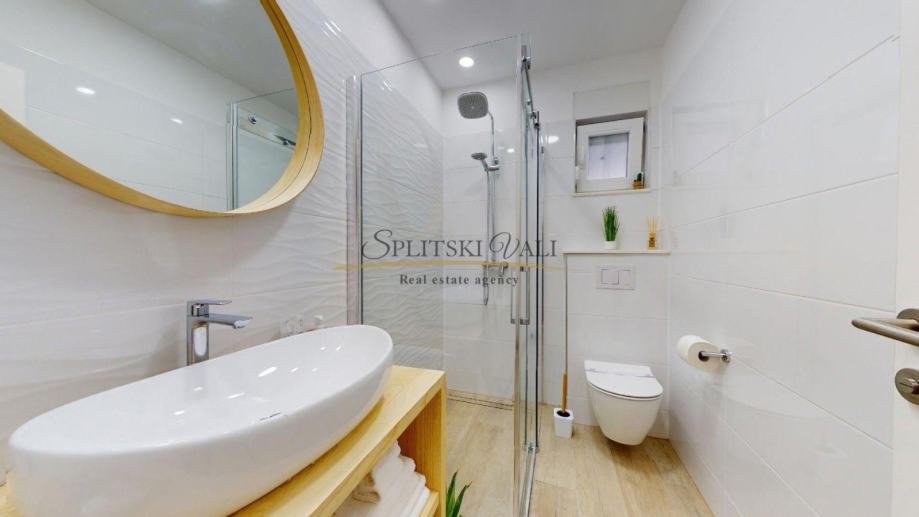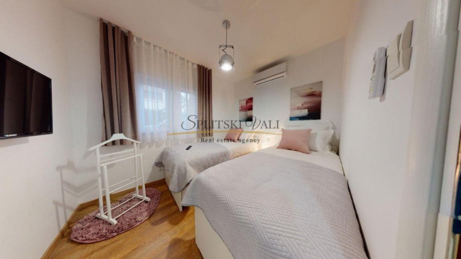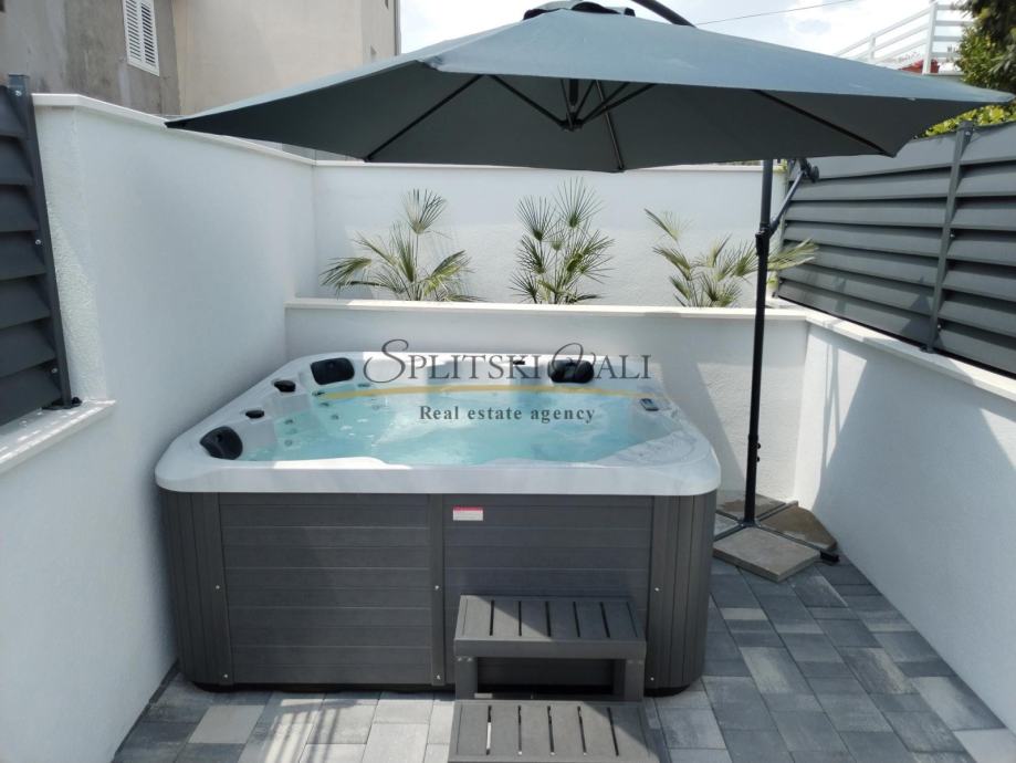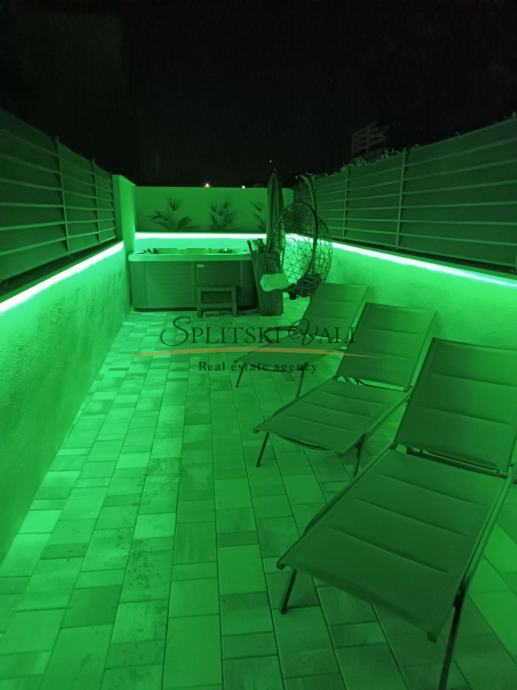 Na drugoj etaži se nalaze dvije klimatizirane sobe,kupatilo, kuhinja sa blagavaonicom i dnevnim boravkom.Terasa površine 24 m2 te balkon površine 12 m2, 220 m2 okućnice te popločanog dijela dvorišta s jaccuzijem i garažom površine 6m2 x 3,5m2