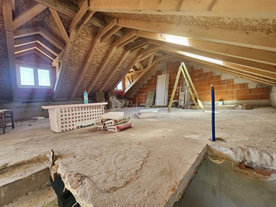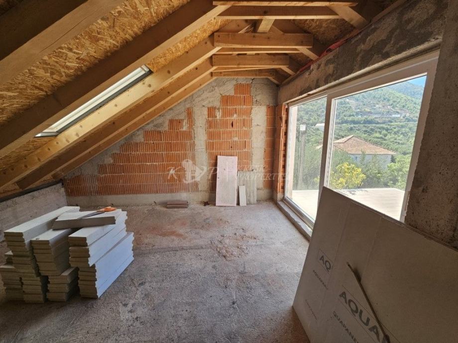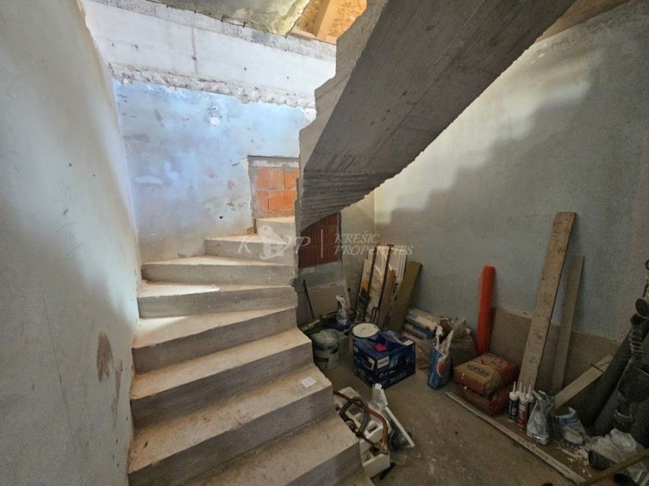 dvoetažni stan u roh bau fazi, s dvije spavaće sobe i kupaonicom na donjoj etaži te dnevnim boravkom i terasom s pogledom na more u visokom potkrovlju