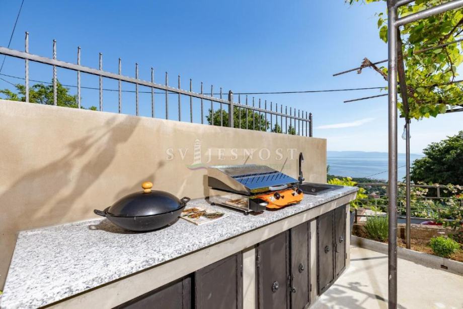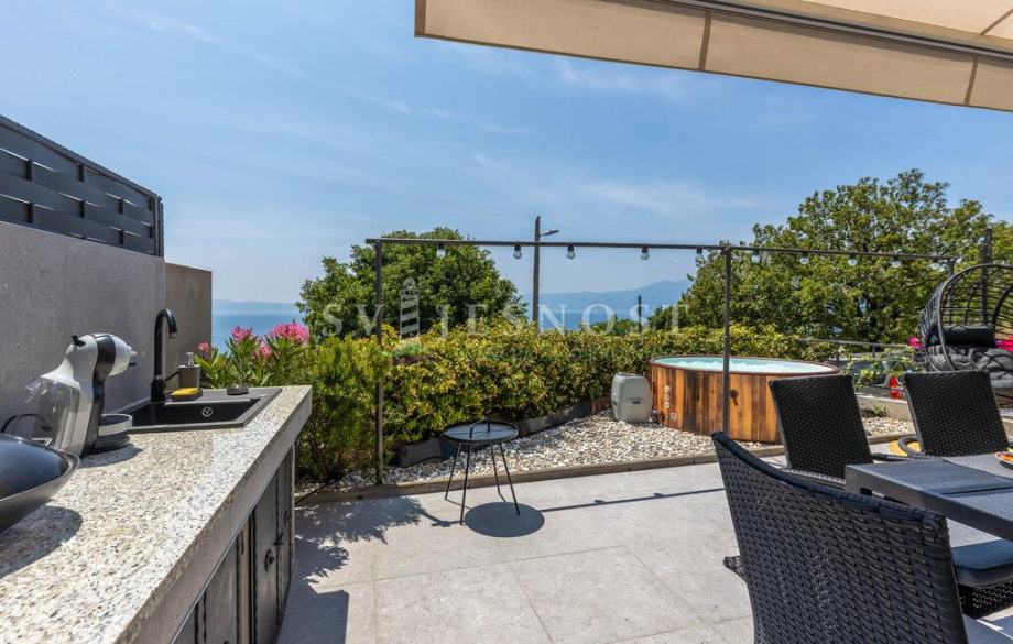 Terasa s roštiljem i jaccuzziem za ugodna druženja i opuštanje uz pogled na more i urednu ozelenjenu okućnicu u mediteranskom štihu.