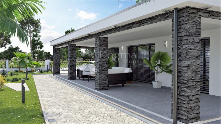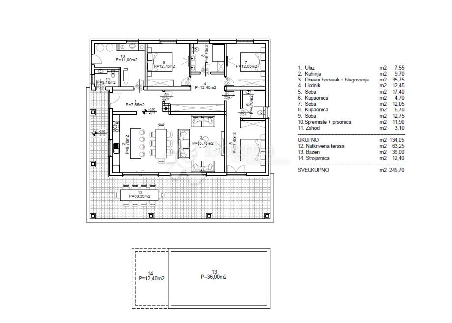 dnevnim boravkom te izlazom na natkrivenu terasu površine 63,25 m2 i plažu bazena površine 36 m2.