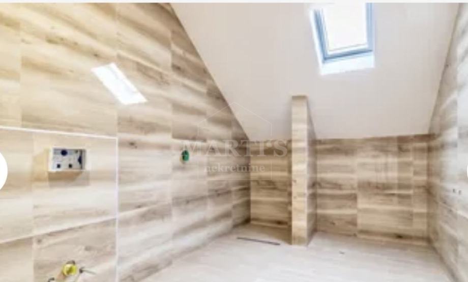 STAN 2. KAT: veliki dnevni boravak, blagovaona i kuhinja, toalet, balkon, drvene zaobljene stepenice za drugu etažu.