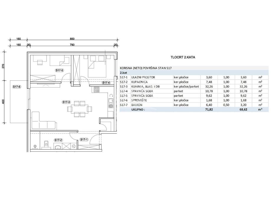 Stan oznake S17, trosoban, nalazi se na 2. katu, te se sastoji od: ulaznog prostora (3,40m2), kupaonice (7,48m2), dnevnog boravka sa kuhinjom i blagovaonicom (32,26m2), spavaće sobe (10,78m2), spavaće sobe (9,62m2), spremišta (1,68m2) i balkona (6,40m2 - obračunski 3,20m2), te jednog vanjskog parkirnog mjesta od 12,50m2 (obračunski 3,13m2). Ukupna prodajna površina je 71,75m2.