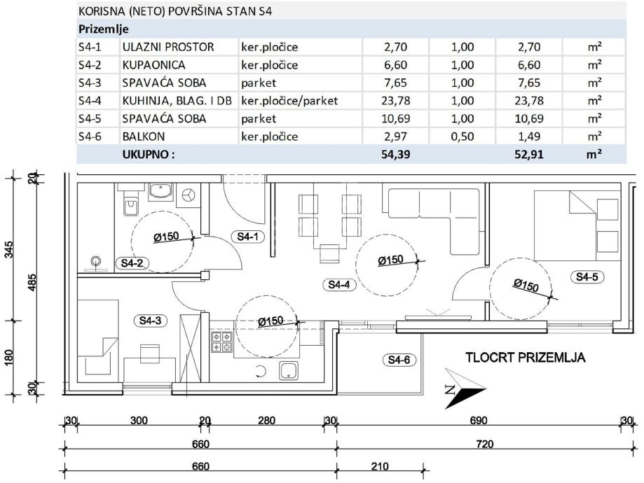 Stan oznake S04, trosoban, nalazi se u prizemlju, te se sastoji od: ulaznog prostora (2,70m2), kupaonice (6,60m2), dnevnog boravka sa kuhinjom i blagovaonicom (23,78m2), sobe (7,65m2), sobe (10,69m2) i balkona (2,97m2 - obračunski 1,49m2), te jednog vanjskog parkirnog mjesta od 12,50m2 (obračunski 3,13m2). Ukupna prodajna površina je 56,03 m2.