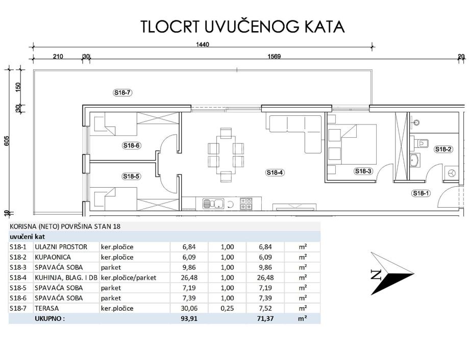 Stan oznake S18, četverosoban, nalazi se na 3. katu, te se sastoji od: ulaznog prostora (6,84m2), kupaonice (6,09m2), dnevnog boravka sa kuhinjom i blagovaonicom (26,48m2), sobe (9,86m2), sobe (7,19m2), sobe (7,39m2) i terase (30,06m2 - obračunski 7,52m2), te jednog vanjskog parkirnog mjesta od 12,50m2 (obračunski 3,13m2). Ukupna prodajna površina je 74,49 m2.