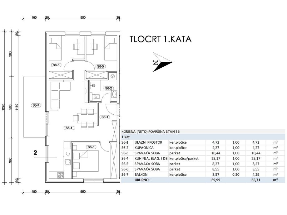 Stan oznake S06, četverosoban, nalazi se na 1. katu, te se sastoji od: ulaznog prostora (4,72m2), kupaonice (4,27m2), dnevnog boravka sa kuhinjom i blagovaonicom (25,17m2), sobe (8,55m2), sobe (8,27m2) sobe (10,44m2) i balkona od 8,57m2 (obračunski 4,29m2) te jednog vanjskog parkirnog mjesta od 12,50m2 (obračunski 3,13m2). Ukupna prodajna površina je 68,83 m2.