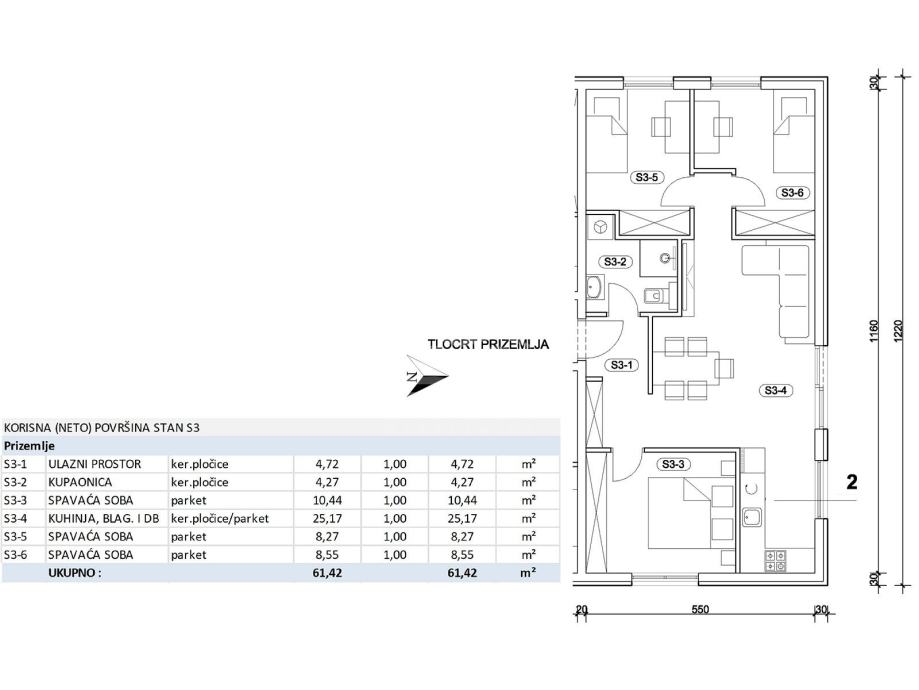 Stan oznake S03, četverosoban, nalazi se u prizemlju, te se sastoji od: ulaznog prostora (4,72m2), kupaonice (4,27m2), dnevnog boravka sa kuhinjom i blagovaonicom (25,17m2), sobe (8,55m2), sobe (8,27m2) sobe (10,44m2) i jednog vanjskog parkirnog mjesta od 12,50m2 (obračunski 3,13m2). Ukupna prodajna površina je 64,55 m2.