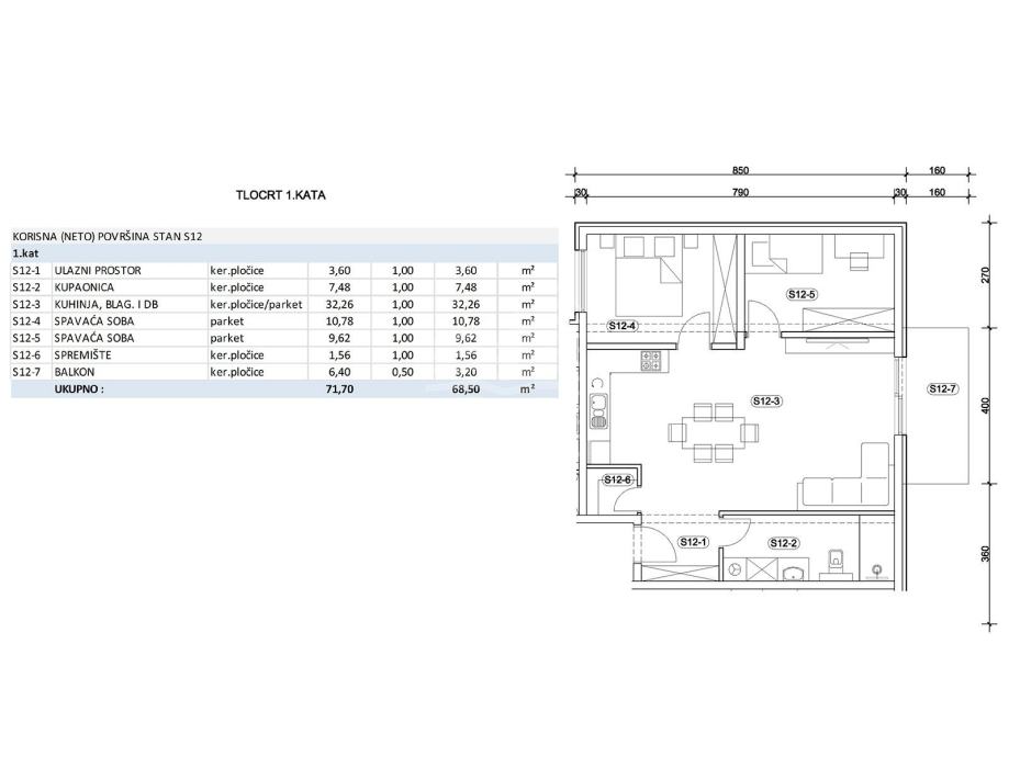 Stan oznake S12, trosoban, nalazi se na 1. katu, te se sastoji od: ulaznog prostora (3,60m2), kupaonice (7,48m2), dnevnog boravka sa kuhinjom i blagovaonicom (32,26m2), spavaće sobe (10,78m2), spavaće sobe (9,62m2), spremišta (1,56m2) i balkona (6,40m2 - obračunski 3,20m2), te jednog vanjskog parkirnog mjesta od 12,50m2 (obračunski 3,13m2). Ukupna prodajna površina je 71,63m2.