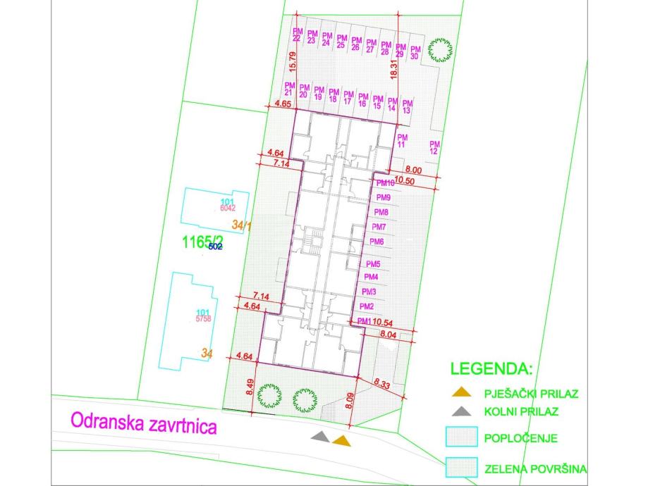 Novi Zagreb - naselje Odra, ulica Odranska Zavrtnica kod broja 34, nalaziti će se u okruženju obiteljskih kuća sa puno prostora okolo zgrade (komforna parcela od 7.100m2). Zgrada će se sastojati od visokog prizemlja i 3 kata (imati će lift) - ukupno 30 stanova (prizemlje, 1. i 2. kat po 8 stanova, te 3. kat 6 stanova). Visoka kvaliteta gradnje, "A" energetski certifikat i sustav grijanja putem dizalice topline!