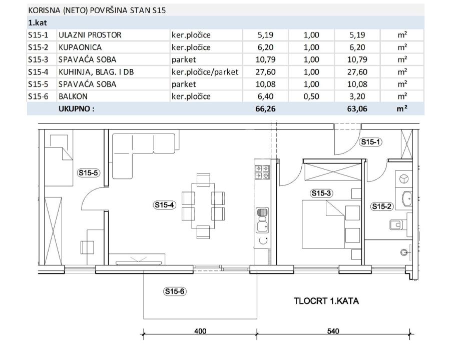 Stan oznake S15, trosoban, nalazi se na 1. katu, te se sastoji od: ulaznog prostora (5,19m2), kupaonice (6,20m2), spavaće sobe (10,79m2), dnevnog boravka sa kuhinjom i blagovaonicom (27,60m2), spavaće sobe (10,08m2) i balkona (6,40m2 - obračunski 3,20m2), te jednog vanjskog parkirnog mjesta od 12,50m2 (obračunski 3,13m2). Ukupna prodajna površina je 66,19m2.