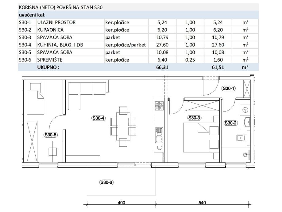 Stan oznake S30, trosoban, nalazi se na 3. katu, te se sastoji od: ulaznog prostora (5,24m2), kupaonice (6,20m2), spavaće sobe (10,79m2), dnevnog boravka sa kuhinjom i blagovaonicom (27,60m2), spavaće sobe (10,08m2) i balkona (6,40m2), te jednog vanjskog parkirnog mjesta od 12,50m2 (obračunski 3,13m2). Ukupna prodajna površina je 64,64m2.
