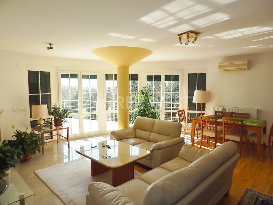 Sastoji se od ulaznog hodnika s gostinjskim wc-om, dnevne sobe s blagovaonicom, kuhinjom i kaminom, koja izlazi na veliku terasu, glavne spavaće sobe s kupaonicom, 2 dodatne spavaće sobe koje izlaze na balkon, dodatne kupaonice, vešeraja i ostave. Stan je potpuno namješten i opremljen ugrađenim ormarima u svakoj sobi, svim aparatima, klimom, i alarmom. Namještaj se može maknuti. Dolazi s parkirnim mjestom.