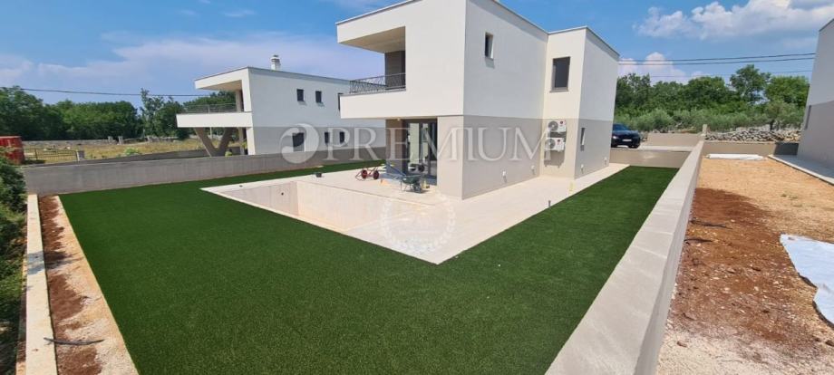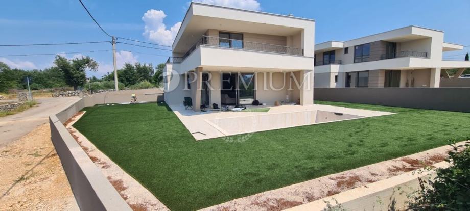 Okolica grada Krka prodaje se moderna, nova kuća s bazenom i pogledom na more! Kuća ima prizemlje i kat, ukupne površine 165 m2.