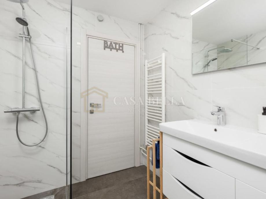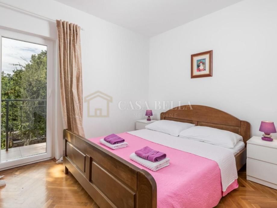 Unutarnje stubište vodi na kat gdje se nalaze četiri spavaće sobe i kupaonica. Dvije sobe imaju izlaz na terasu, a druge dvije na balkon, pružajući obilje prirodnog svjetla i osjećaj otvorenosti. Visoko potkrovlje, koje uključuje dodatne dvije spavaće sobe i kupaonicu, već ima instalacijsku pripremu za kuhinju, pa se uz minimalna ulaganja može pretvoriti u dodatni studio apartman.